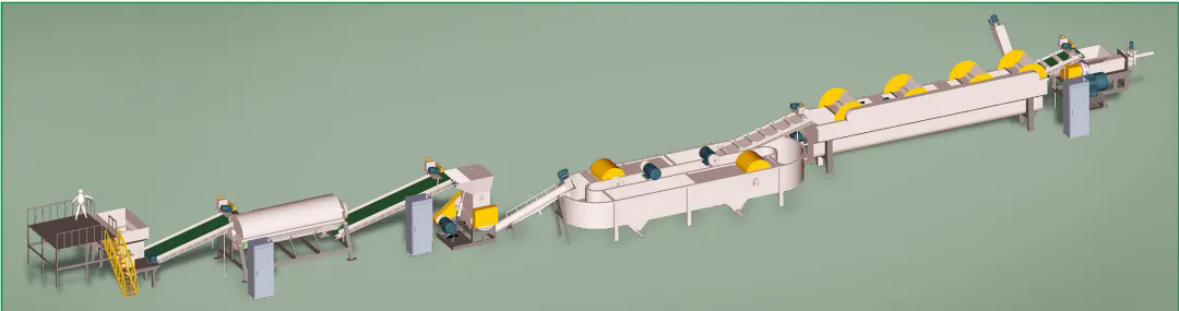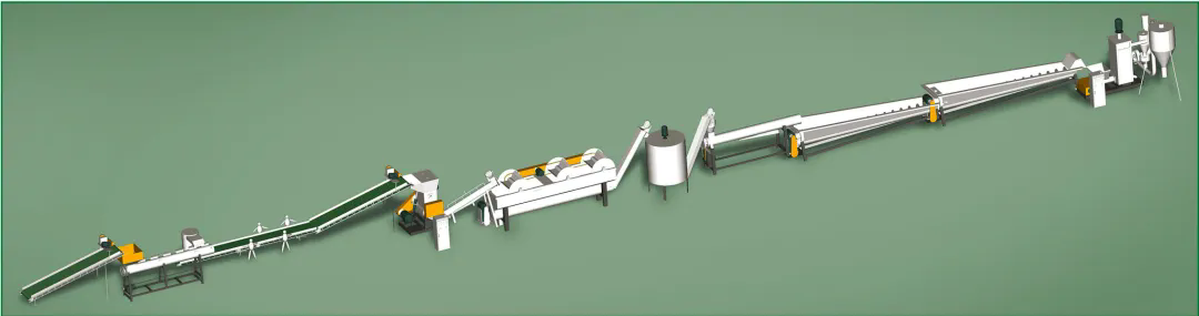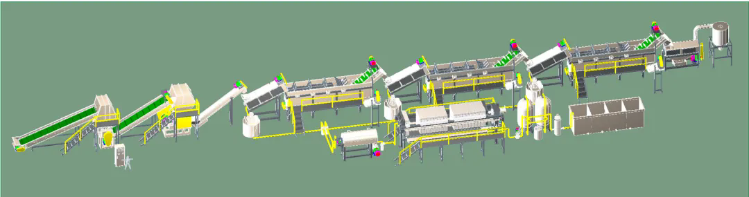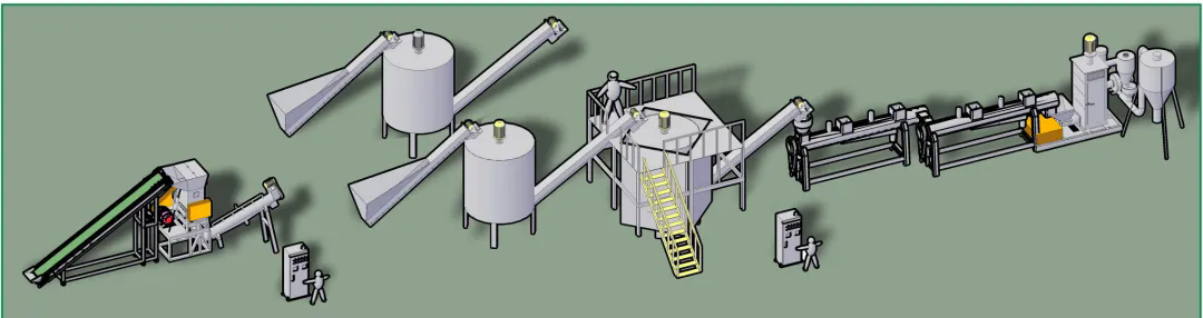 此套生產(chǎn)線主要處理日常生活中所廢舊的牛奶瓶、化妝品瓶、洗發(fā)水瓶、藍桶、廢舊框、塑料椅、塑料桶等HDPE、PP、PO等浮水硬質(zhì)塑料的再生回收清洗,進而可以進行造粒后再利用。從節(jié)能、環(huán)保方面為用戶考慮,采用不同的方案流程,適合不同廢塑料的回收,提供配套的分揀輸送帶、高速清洗機、塑料表面不干膠標簽的去除、金屬分離器、水循環(huán)處理系統(tǒng)等。